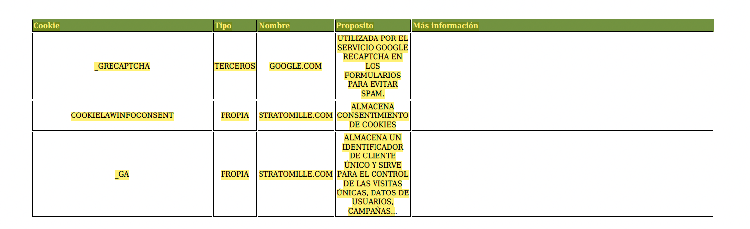 Si el usuario deseara más información sobre cómo revocar el consentimiento prestado o sobre el procedimiento para deshabilitar las cookies, así como realizar alguna pregunta sobre la Política de Cookies de la web, se puede poner en contacto con STRATO MILLE S.L. a través de la siguiente dirección INFO@STRATOMILLE.COM indicando en el asunto “Política de Cookies”.