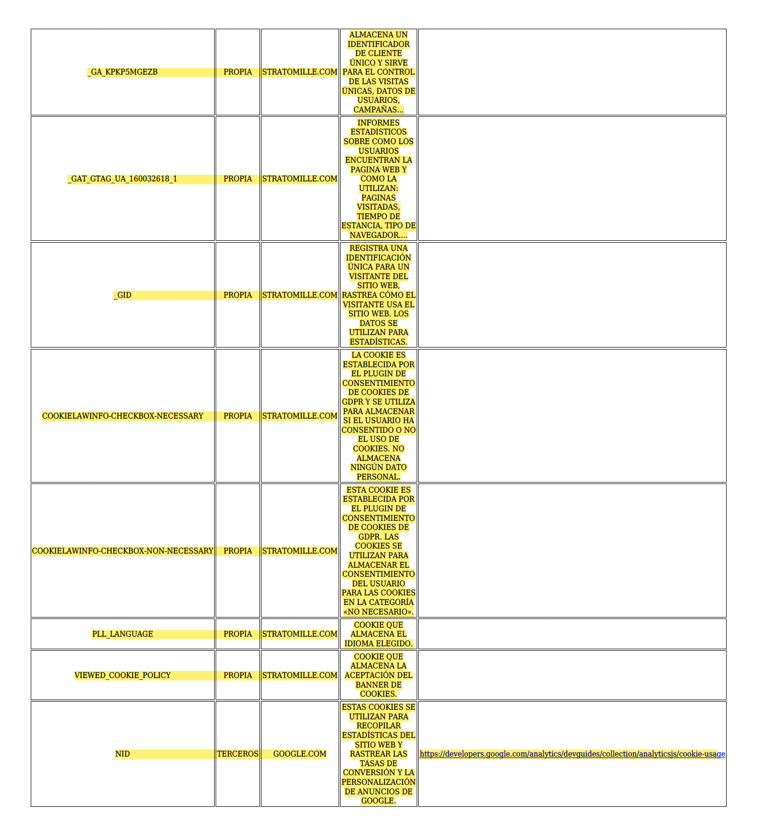 Nombre del editor, nombre de la cookie, «tipo» y Propósito.